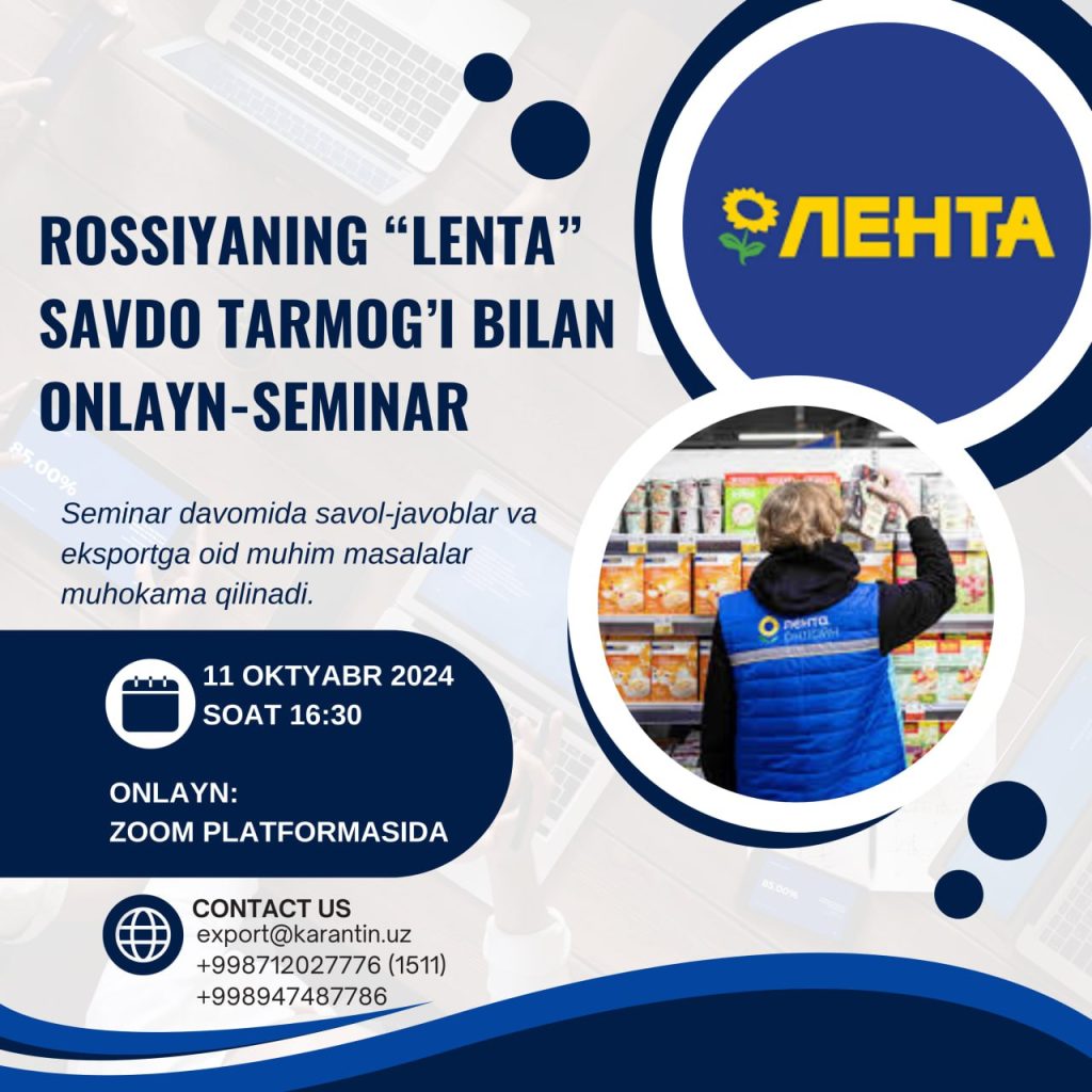2024 yil 11 oktyabr kuni soat 16:30 da “Lenta” savdo tarmog‘i va eksportchilar o‘rtasida onlayn-seminar bo‘lib o‘tadi. Seminar davomida savol-javoblar va eksportga oid muhim masalalar muhokama qilinadi.
