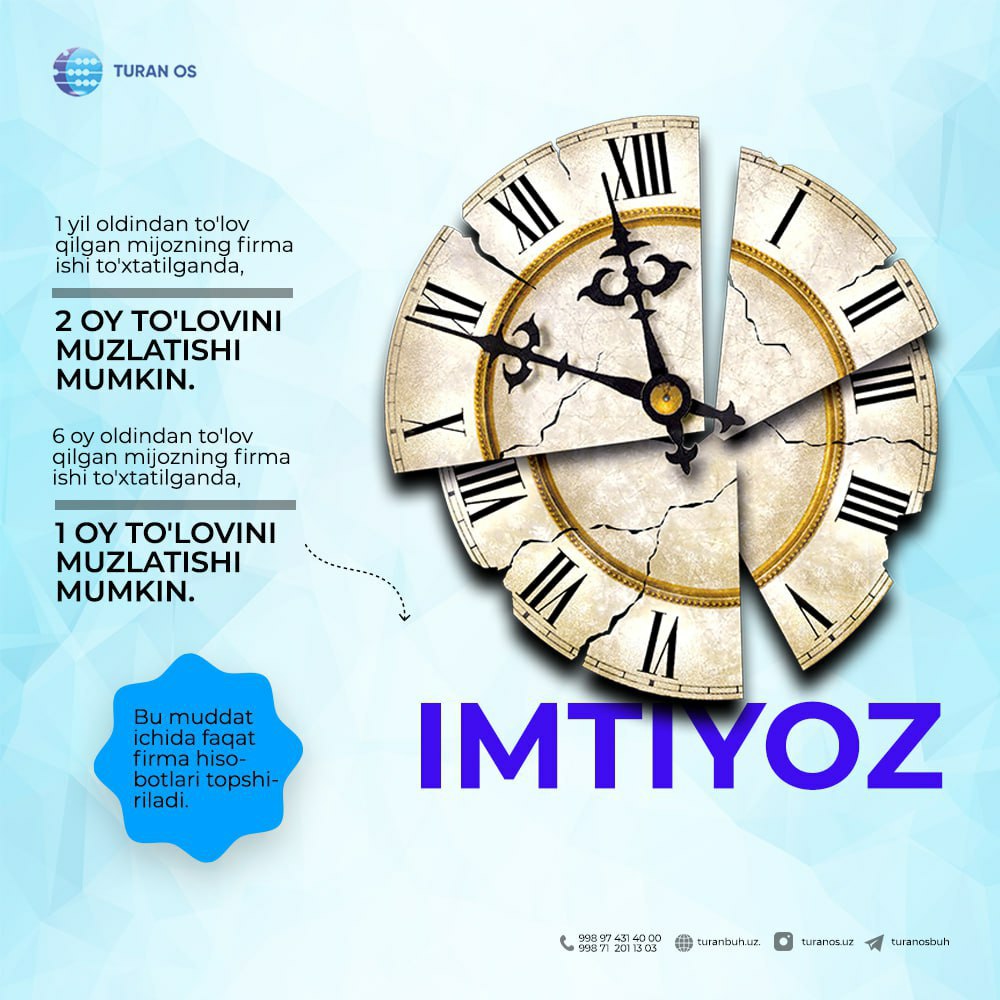 Endilikda yil davomida to’lov intizomiga amal qilgan mijozlar uchun 50 BHM miqdorida 1 oy muddatli foizsiz moliyaviy KREDIT taklifi mavjud BU HALI HAMMASI EMAS❗️Yil yakuni bo’yicha kompaniya mijozlari o’rtasida🏆 To’lov intizomiga amal qilgan eng yaxshi tadbirkor🏆 Eng vijdonli soliq to’lovchisikabi nominatsiyalar bo’yicha ko’rik-tanlov o’tkaziladi. G’oliblar “TURAN OS” tomonidan qimmatbaho esdalik sovg’alar bilan taqdirlanadi