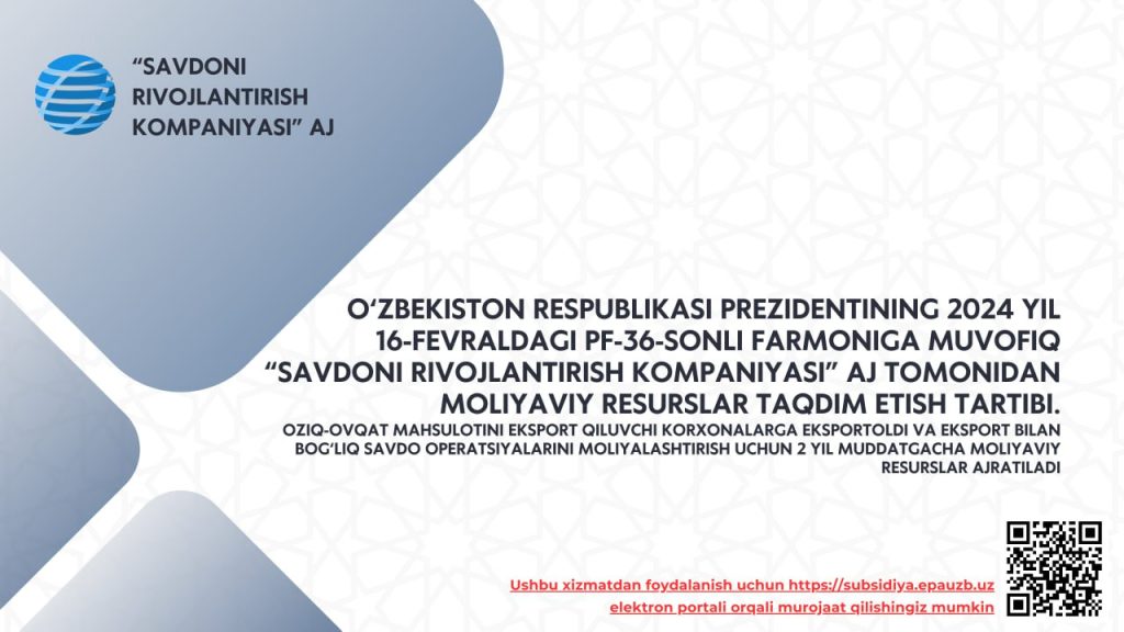 Oziq-ovqat mahsulotini eksport qiluvchi korxonalarga eksportoldi va eksport bilan bog‘liq savdo operatsiyalarini moliyalashtirish uchun 2 yil muddatgacha moliyaviy resurslar ajratiladi: