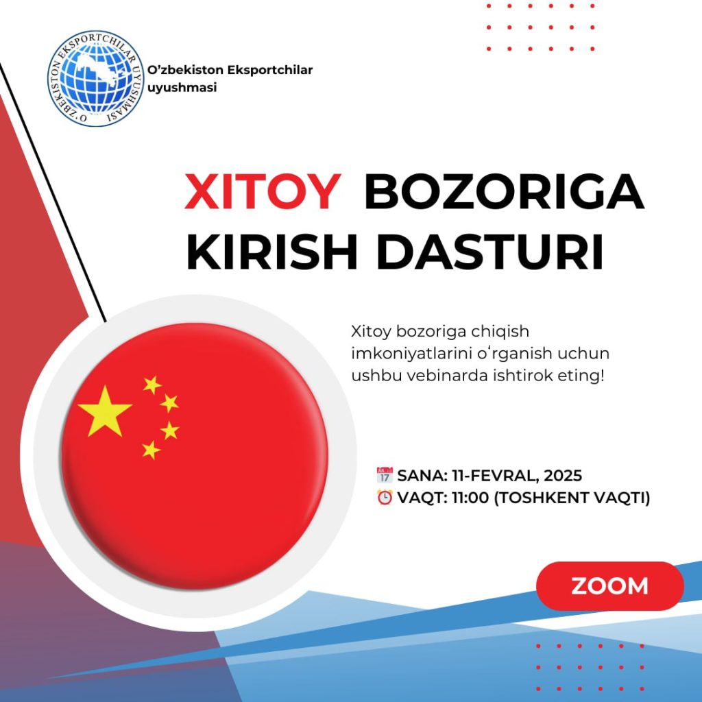 🚀 Xitoy bozoriga chiqish imkoniyatlarini oʻrganish uchun ushbu vebinarda ishtirok eting!
